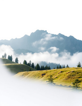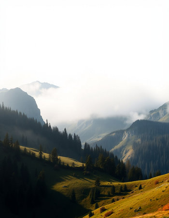A misty morning in the mountains of Switzerland, with rolling hills and forests shrouded by fog, creating an ethereal atmosphere. The photograph captures the serene beauty of nature's tranquility. --ar 3:2 --v 6.1 Job ID: 7b93aa38-cba9-4afe-9609-19f108f7f677