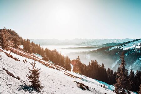 Snowy cold alpine landscape in winter with mist clinging to steep forested valleys and distant mountain ranges