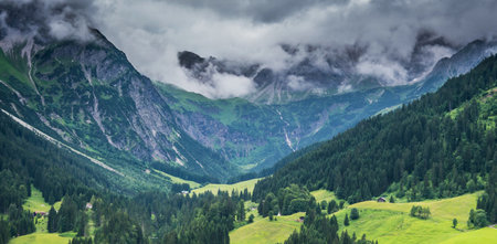 Kleinwalsertal mountains landscape panorama background - Mountain panorama in summer with blue sky and clouds