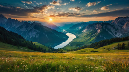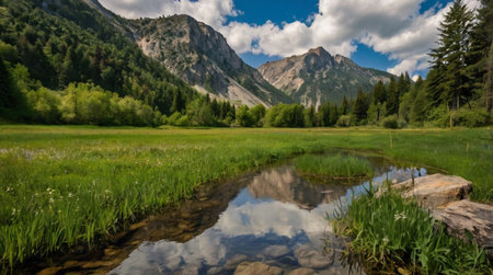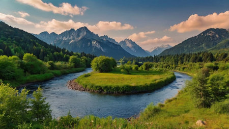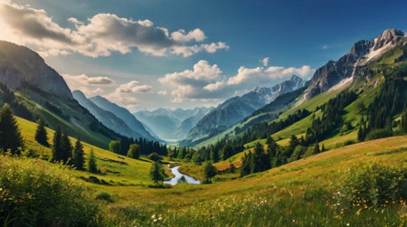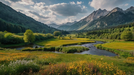 Beautiful mountain landscape with meadow and river. Colorful summer nature background.