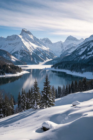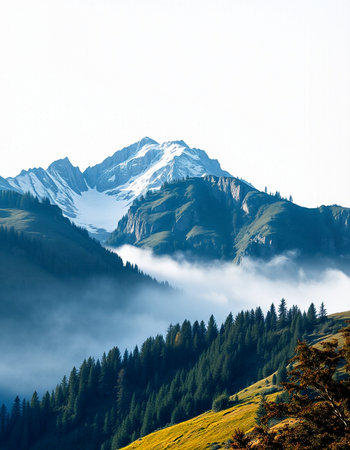 Beautiful mountain landscape with snow-capped peaks and conifer forest