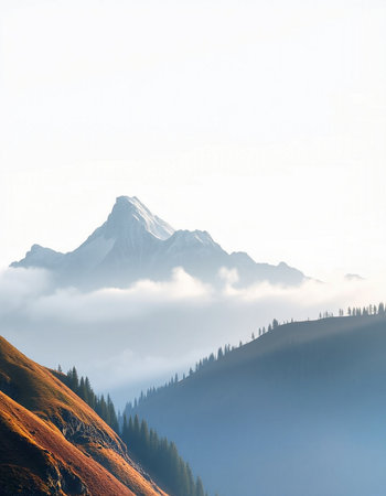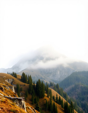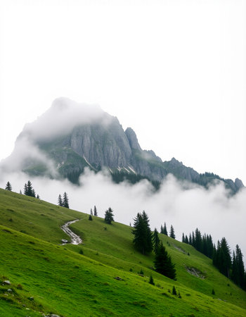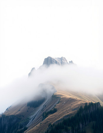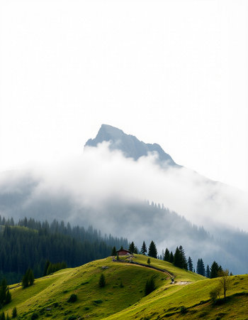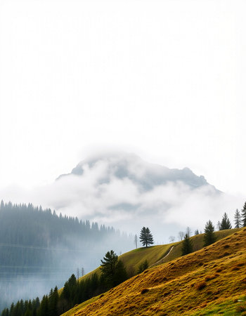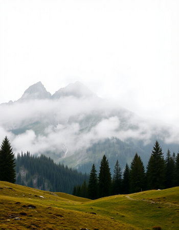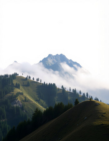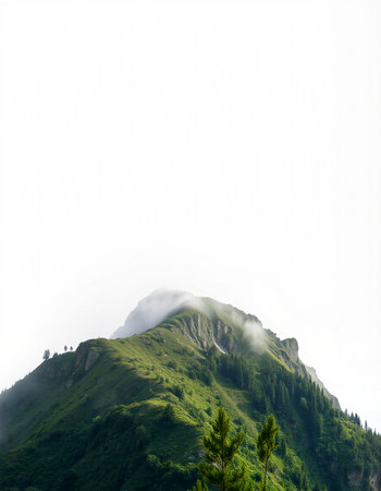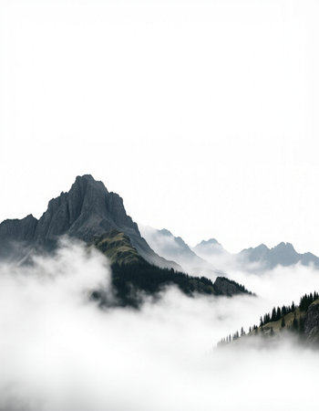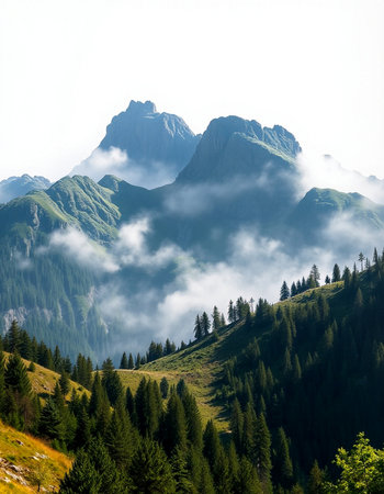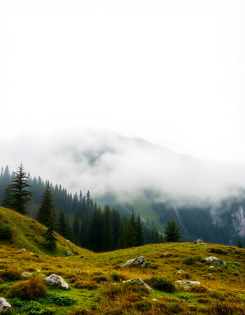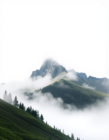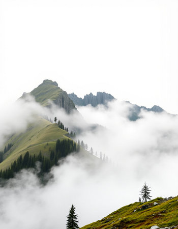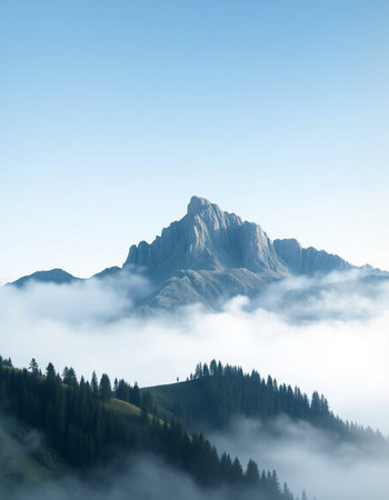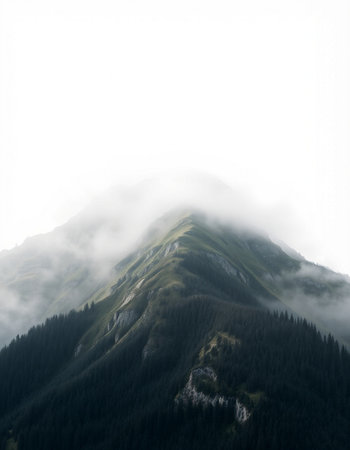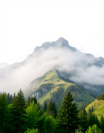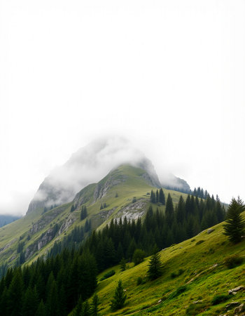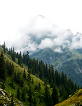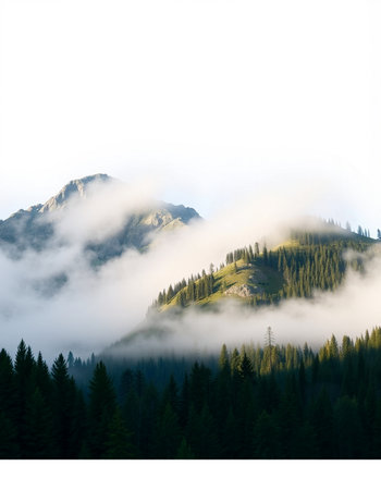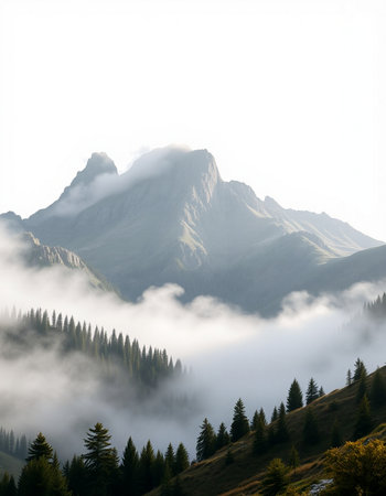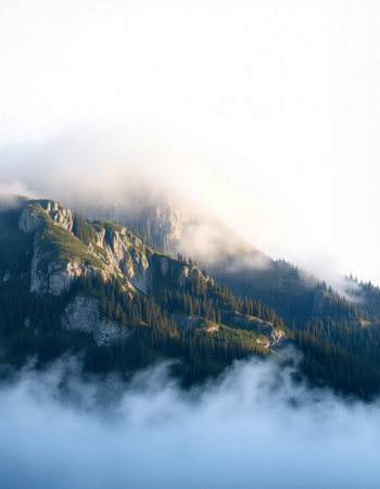 Discover a breathtaking mountain landscape shrouded in fog, with lush forests ascending into the clouds, creating a serene and tranquil atmosphere perfect for nature lovers.