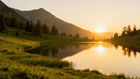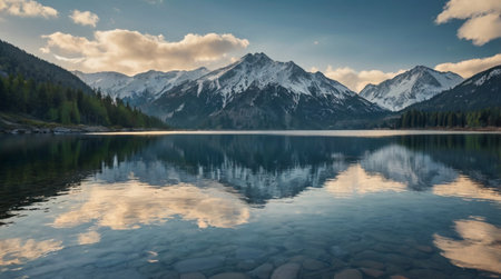 A serene twilight scene with a tranquil mountain lake reflecting the surrounding peaks and the soft glow of the evening sky.