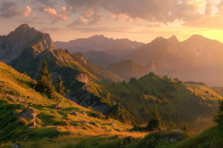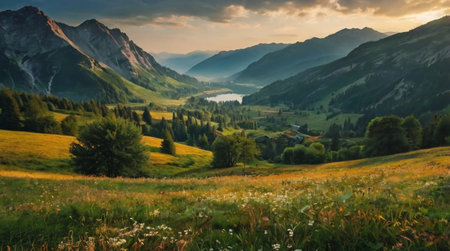 Panoramic view of alpine meadow at sunset in summer.