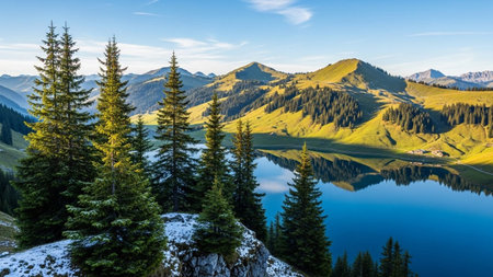 View from alpine meadow to lake and mountains. spring summer