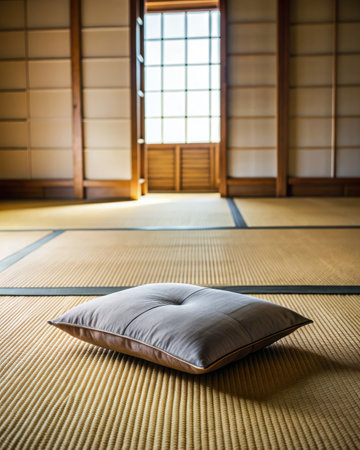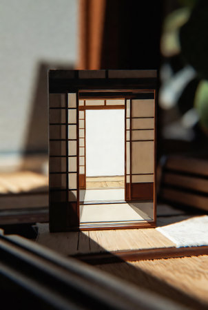 This image showcases a serene arrangement of vintage woven baskets stacked harmoniously within a traditional Japanese interior, featuring soft natural light.