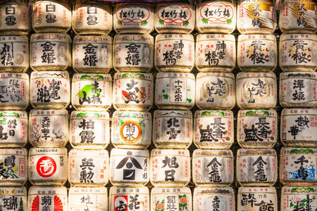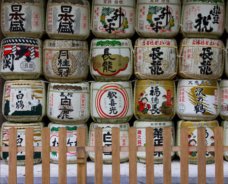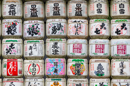 Tokyo, JapanAugust 5th, 2017: Barrels of Sake (Japanese rice wine) at Meiji-Jingu Shrine, donated by sake brewers from around Japan with the sake being used for shrine ceremonies and festivals.
