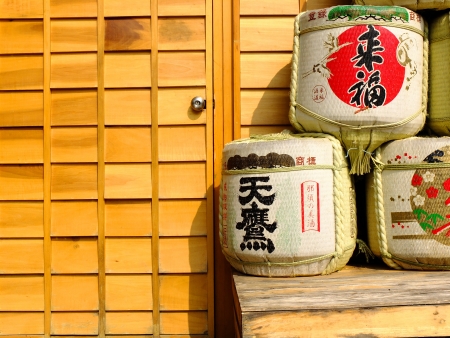 TOKYO, JAPAN - MARCH 21: Sake containers at Yoyogi Park near Meiji Shrine on March 21, 2015 in Tokyo, Japan.