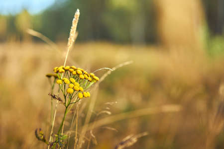 Bright yellow tansy flowers grow among the dark grass, which are field medicinal plants.