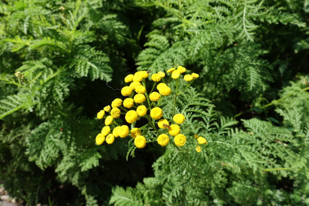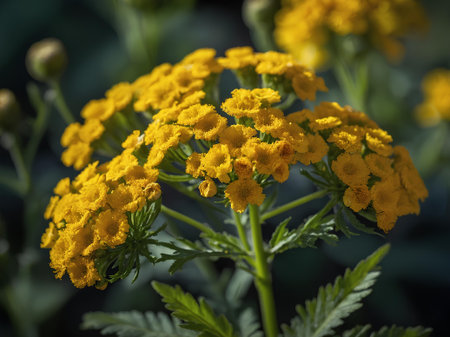 Close up of Tanacetum vulgare (tansy) with aromatic foliage and clusters of mustard-yellow, button-like flowers. It is a medical plant.