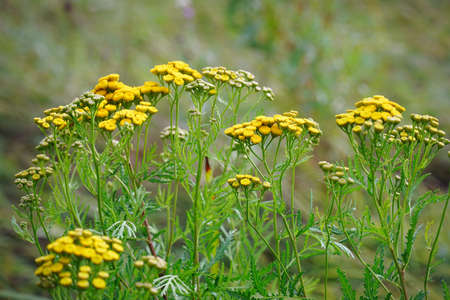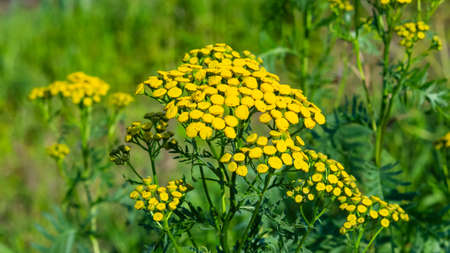 Yellow wild flowers of tansy on a natural background. Medicinal plant tansy. Tanacetum vulgare