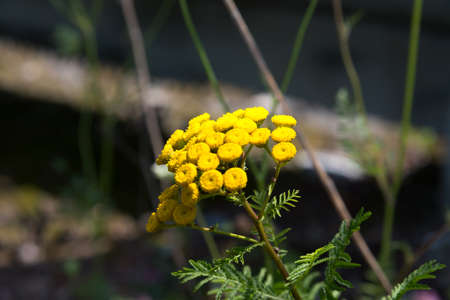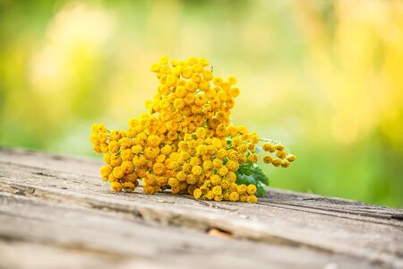 Yellow flowers of common tans. Tanacetum vulgare plant on wooiden surface outdoors
