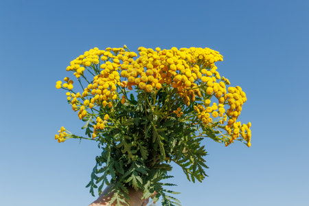 Fresh bouquet of tansy flowers with bright yellow button-shaped blooms and green fern-like leaves, held up against a clear summer sky.