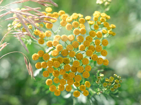 Yellow flowers of a medicinal wild plant tansy closeup.