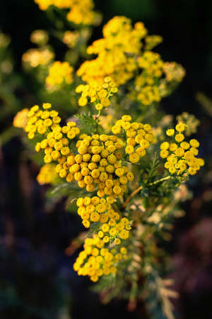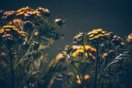 Yellow flowers of tansy on a dark background. Field of yellow wild plants of medicinal herbs tansy flower.