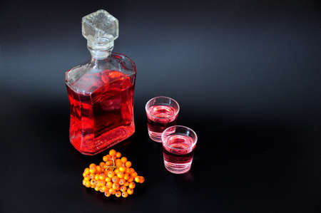 Rowan liqueur, homemade alcohol in two glasses and a bottle next to bunches of ripe berries on a black background. Close-up.