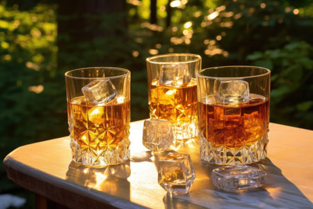 sunlit whisky glasses with ice on garden table, created with generative ai