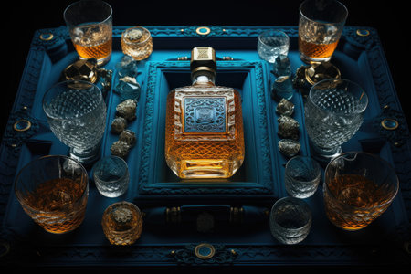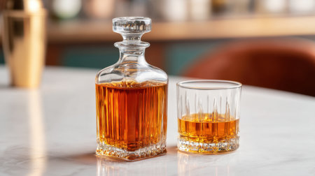 A stunning whiskey decanter paired with a crystal glass showcases the rich amber hue of the spirit in an elegant bar environment, perfect for any gathering.