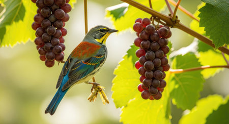 A male starling is sitting on a bunch of grapes in a vineyard.