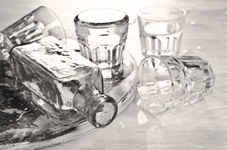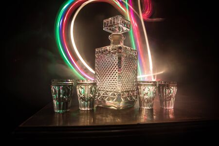 A beautiful carafe with vodka stands on a wooden table with glasses. Dramatic toned foggy background with light. Selective focus. Club drink concept.