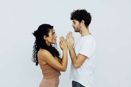 Latin American man and woman pray to god together on dark studio background. Cinematic effect
