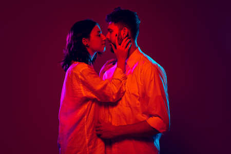 Smiling young man and woman look at each other isolated on dark red trendy color background in neon light. Human emotions