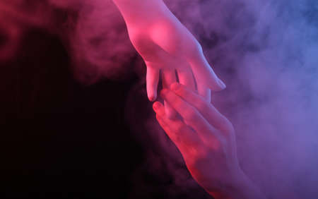 Mannequin and human hand held with red-blue neon light in smoke