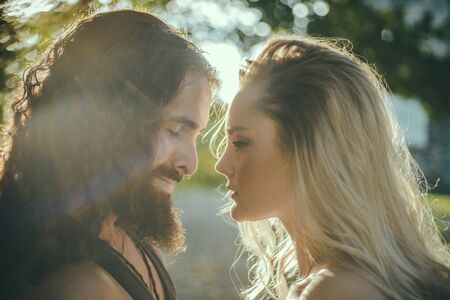 Sensual couple in the tender passion. Couple in love face to face, tender hugging and kissing. Beautiful woman and handsome man boyfriend.
