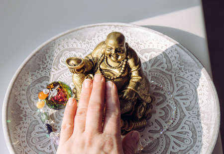 Person hand rubbing small golden laughing Buddha figurine tummy. It believed to bring happiness, good fortune and wealth. Buddai monk.