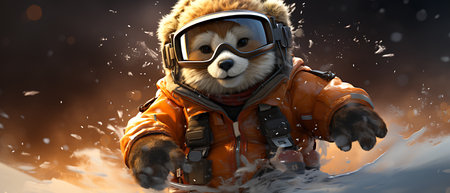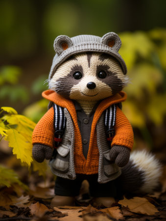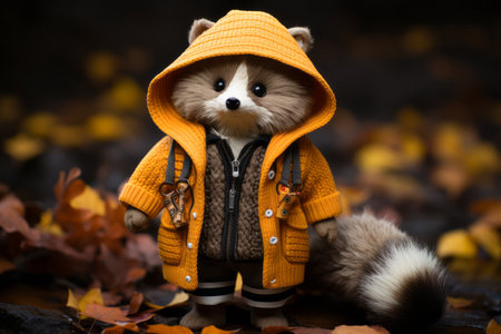 a small raccoon wearing an orange jacket and hat