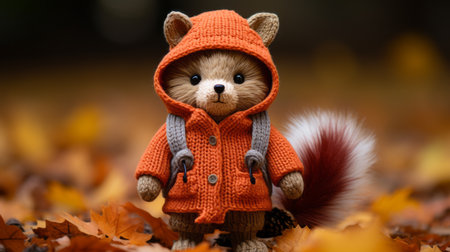 a stuffed animal squirrel wearing an orange coat