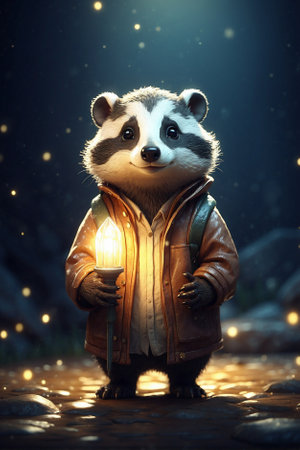 Little Cute Badger Cub Standing in the Dark. Shining Golden Aura, Snow Glow, Magical Badger Cub