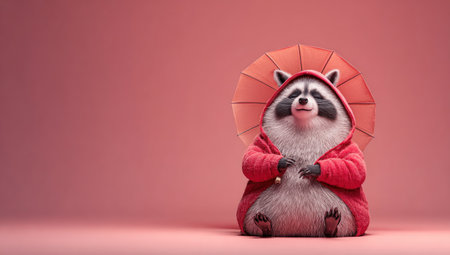 Smiling raccoon in red raincoat and parasol, against a pastel pink background