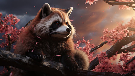 Funny red panda on a background of blooming sakura AI generative