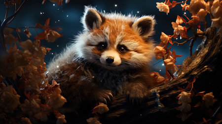 Red panda bear in the forest with garland lights on background. AI generative