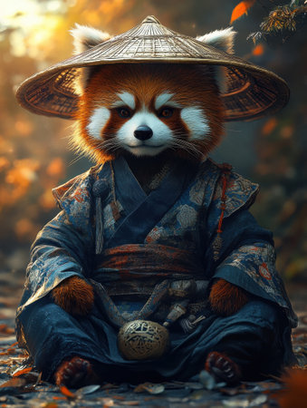 Red Panda in Traditional Japanese Clothing and Hat Meditating in Nature