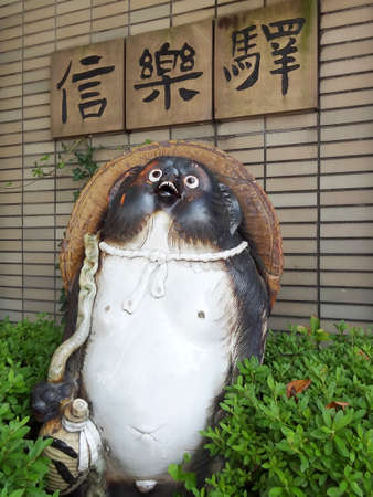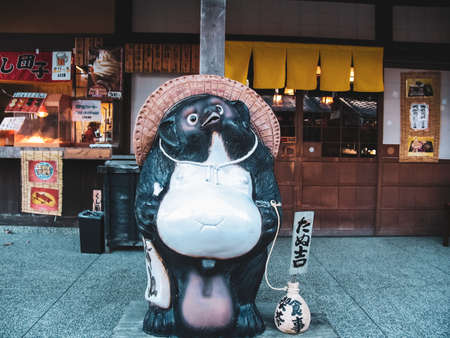 KYOTO, JAPAN - OCTOBER 18, 2019: Ceramic statues of two Bake-danuki near the Japan's bar. They are the kind of folklore supernatural beings (tanuki yokai ) revered as kami, ensuring success in trade.