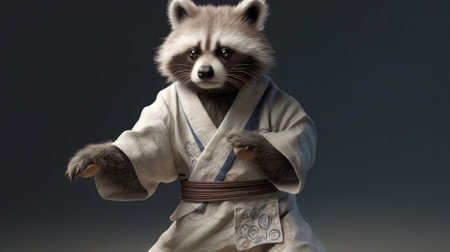 Raccoon in white kimono doing karate. Created with Generative AI technology