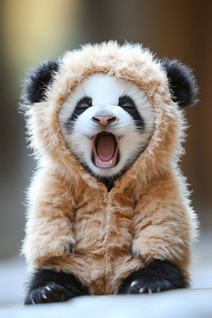 Baby panda in lion costume, yawning adorably