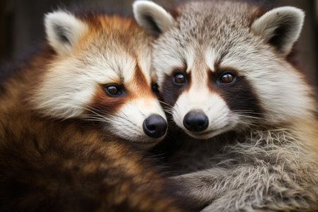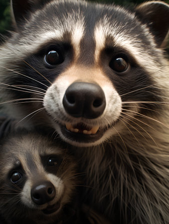 Close up portrait of a raccoon with two little puppies in their mouth