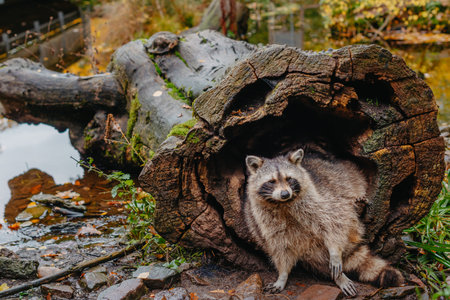 Gorgeous raccoon cute peeks out of a hollow in the bark of a large tree. Raccoon (Procyon lotor) also known as North American raccoon sitting hidden in old hollow trunk. Wildlife scene. Habitat North America, expansive in Europe, Asia