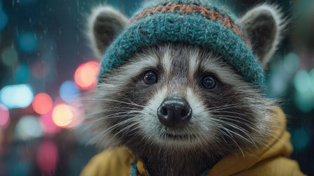 Close up raccoon with knitted beanie and yellow jacket in light rain in a night city scene