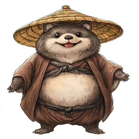 illustration hand drawn of a tanuki statue, round belly and friendly expression, detailed fur texture and traditional straw hat, Japanese culture, cultural item, isolated on white background --chaos 10 --ar 1:1 --style raw --v 6.1 Job ID: 4eb74588-17c0-47a8-bc3b-57287d34ba33