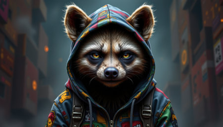 Cool anthropomorphic raccoon wearing a colorful hoodie standing confidently in an urban setting with blurred background details and a playful expression