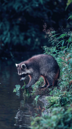 A playful raccoon stands near the water exploring its surroundings The tranquil scene captures natures beauty and the charming antics of wildlife in their natural habitat