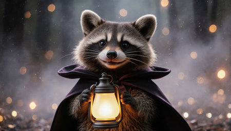 A mischievous raccoon and sparkling bokeh. The glowing lantern adds light to the cinematic Halloween background.