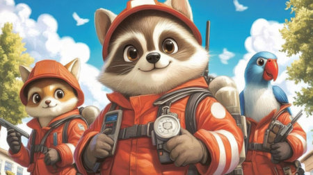 Three raccoons in fireman outfits standing next to a bird, AI