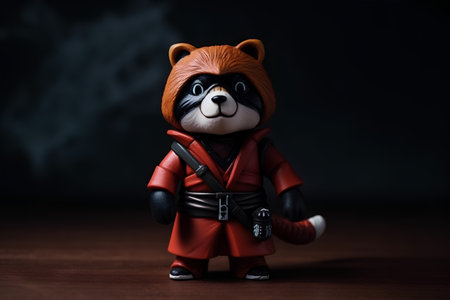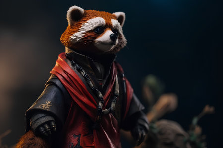 Lego minifigure dressed as a Red Panda. Studio shot on dark background.