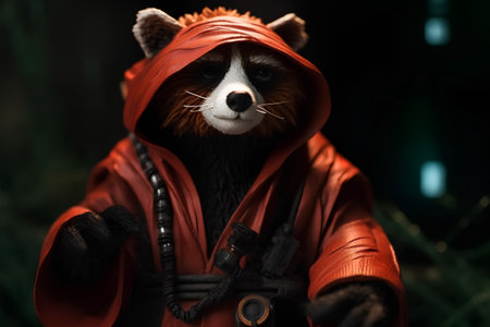 red panda in a red raincoat with a gun in his hand