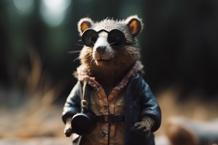 vintage portrait of raccoon with binoculars in the forest